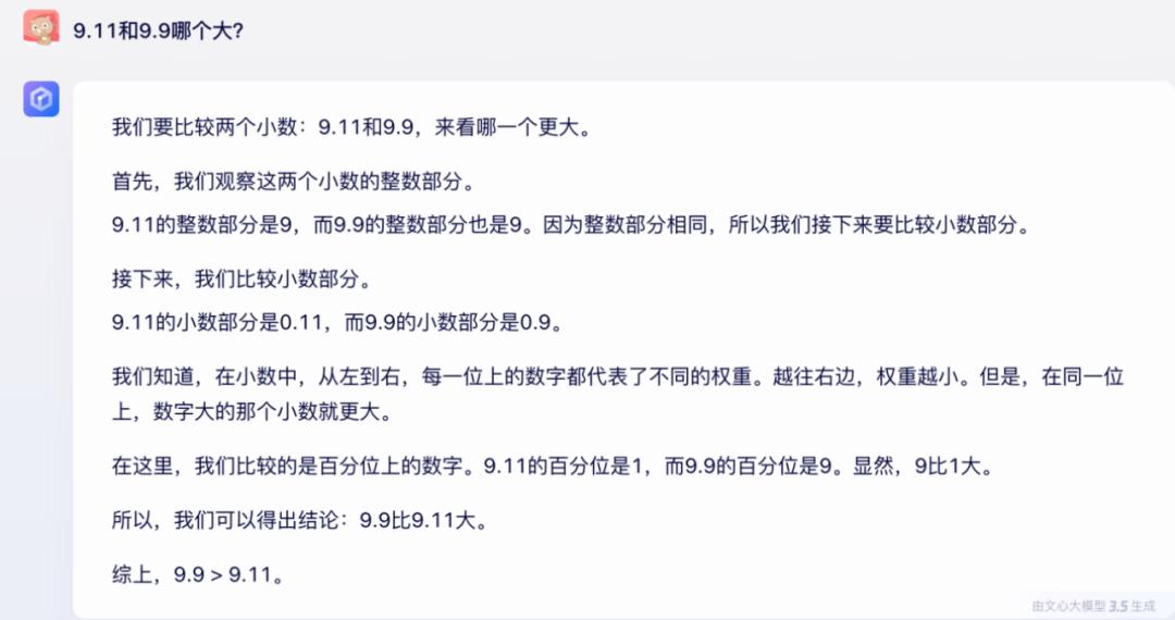 面对 9.11 和 9.9 谁大时,文心 3.5 回答正确;当我们问它二者相差多少时,它绕了一大圈,终于给了正确结论。