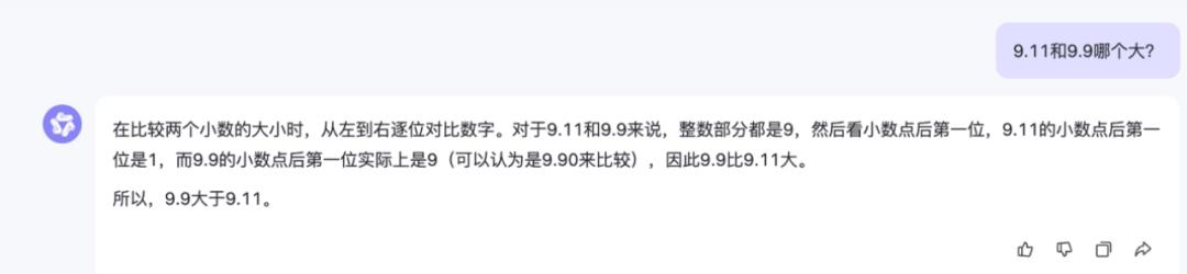 我们问 9.11 和 9.9 谁大,豆包分析得头头是道,还能将其置于日常生活场景中。例如,跑步比赛选手用时 9.11 秒和 9.9 秒,意味着 9.11 秒速度更快;从价格的角度来看,9.9 元的商品更贵。不过,一到结论它就回答错误。