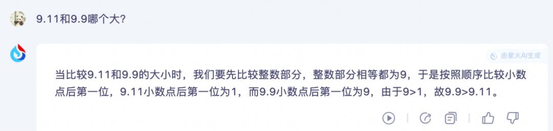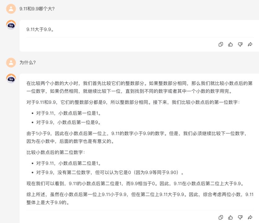 此外,在处理类似「9.11 比 9.9 大」的场景时,大模型通常会通过分词器 tokenizer 进行处理。分词器在解析这类表达时,可能会把数字辨认为日期或版本号进行比较,最终导致回答错误。这种处理方式是由分词器的特定算法和机制决定的。