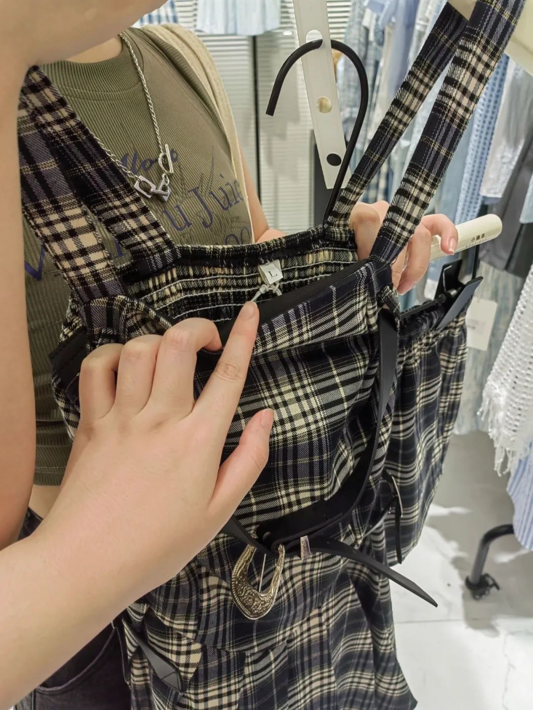 某实体店里,L码吊带裙与身材娇小女生的对比。(图/阿瑞 摄)有时,女生们甚至不得不去买男装。05后的小潘说:“我买裤子喜欢选男款,因为女裤的裆部总是做得很短,坐着又勒肚子。”Lisa更是买过不少男款上衣,但她又不想总是买男装,最近开始考虑定制店,“把三围数据和想要的款式发过去,店家做好之后寄来,会比一般衣服贵些,一件至少300元”。