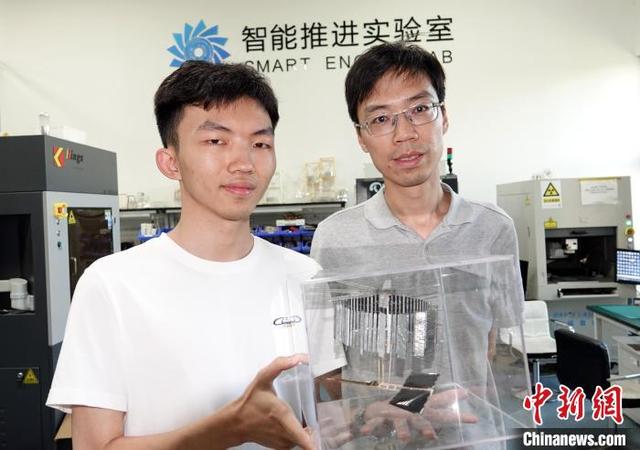 7月17日下午,论文通讯作者、北航教授漆明净(右)和论文共同第一作者、北航博士研究生彭谨哲在智能推进实验室接受采访,展示静电飞行器样机并合影。中新网记者 孙自法 摄