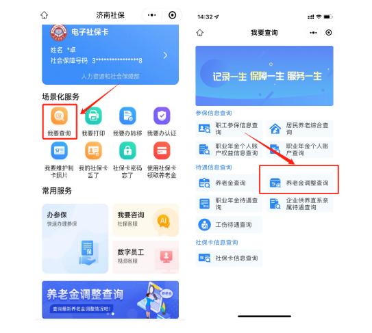 登录“济南社保”微信公众号——办社保——我要查询——养老金调整查询。