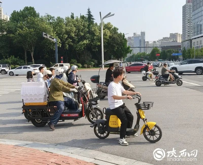 在位于科技八路与唐延路十字附近看到,不少骑行者安全意识薄弱,一边骑车一边看手机,逆行、闯红灯,挤占机动车道,无牌无盔上路等行为屡见不鲜,还有两名穿校服的学生共乘一车,在机动车道上蛇形走位,非常危险。