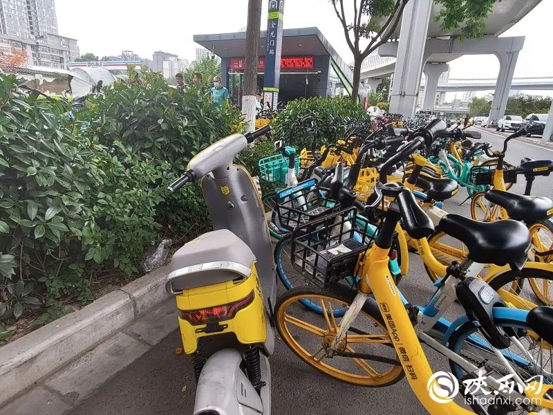 “每天上下班时间乌泱泱的全是车子,出了地铁口还得绕行,很不方便。”市民刘女士愤愤地说,早晚高峰时段,地铁5号线金光门站多个出口外经常堆满了共享单车和共享电动自行车,旁边的非机动车道也被堵死,压根没人管。而在橡树街区的人行道上,个别市民在使用共享电动自行车后,随意一停,把公共空间变成了“专属停车场”,道沿上横七竖八的车子把盲道挡得严严实实,行人经过也只能走迷宫似地穿梭绕行,在绿化带上也有“躺平”的共享电动自行车。