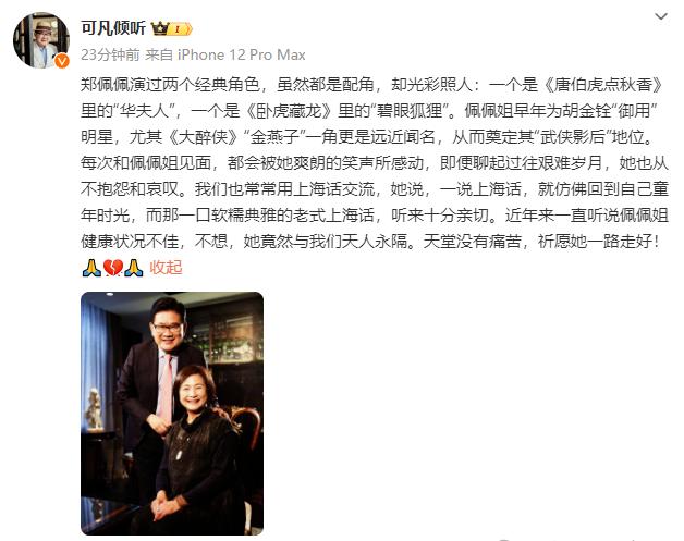 主持人曹可凡突然发文透露,郑佩佩去世,享年78岁。
