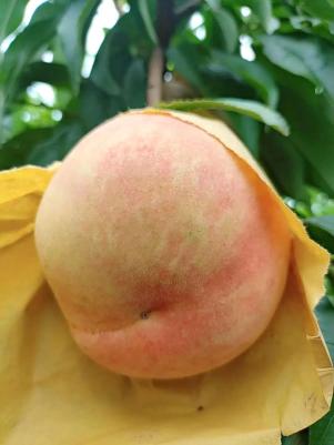湖景桃呈圆球形,果顶略凹陷,果皮乳黄,近缝合线处有淡红霞,肉质紧实细腻。湖景桃一般在5-6两左右,7两以上为极品大桃。