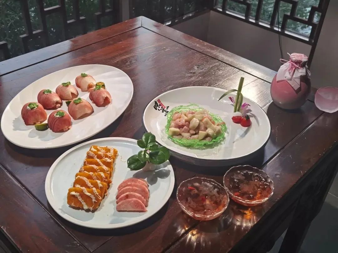 △炸桃片、桃丁炒虾仁、桃片沙拉