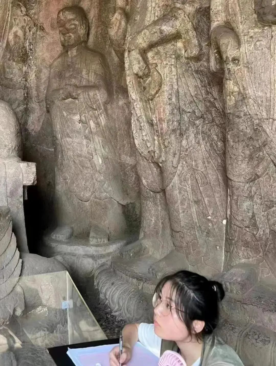 钟芳蓉在龙门石窟考察陕西周原考古实习基地、河北省阳原县泥河湾遗址和四川广汉三星堆遗址,通通留下了钟芳蓉悉心学习和实践的足迹。