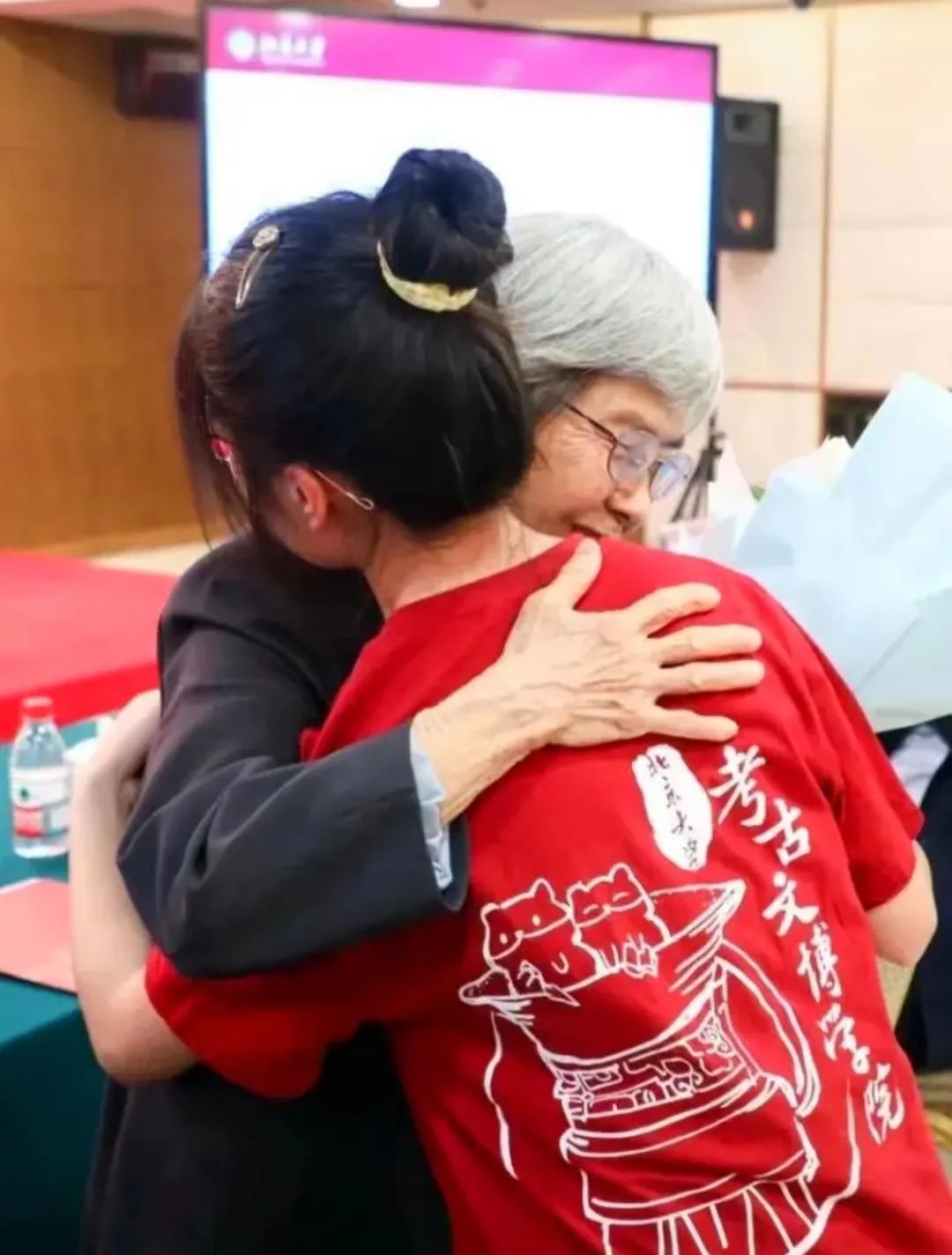 2023年,在樊锦诗先生向母校的捐赠仪式上,钟芳蓉终于等到了与偶像深情拥抱的机会。