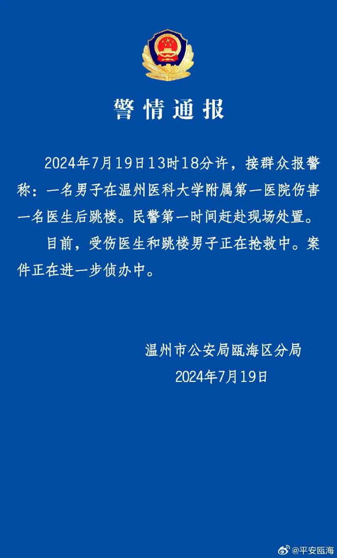 据警方通报:2024年7月19日13时18分许,按群众报警称,一名男子在温州医科大学附属第一医院伤害一名医生后跳楼。民警第一时间赶赴现场处置。目前,受伤医生和跳楼男子正在抢救中。案件正在进一步侦办中。