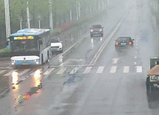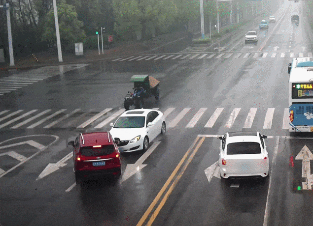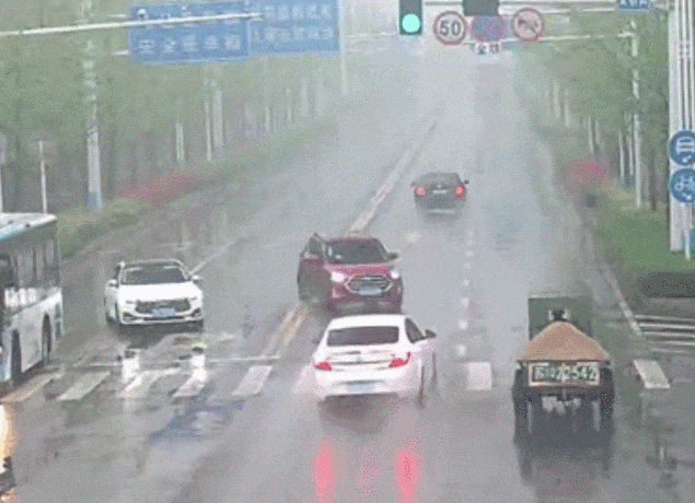 事故还原近日某雨天,江苏扬州。在邗江区吉安路安桥路路口,车辆正在按顺序通过绿灯。