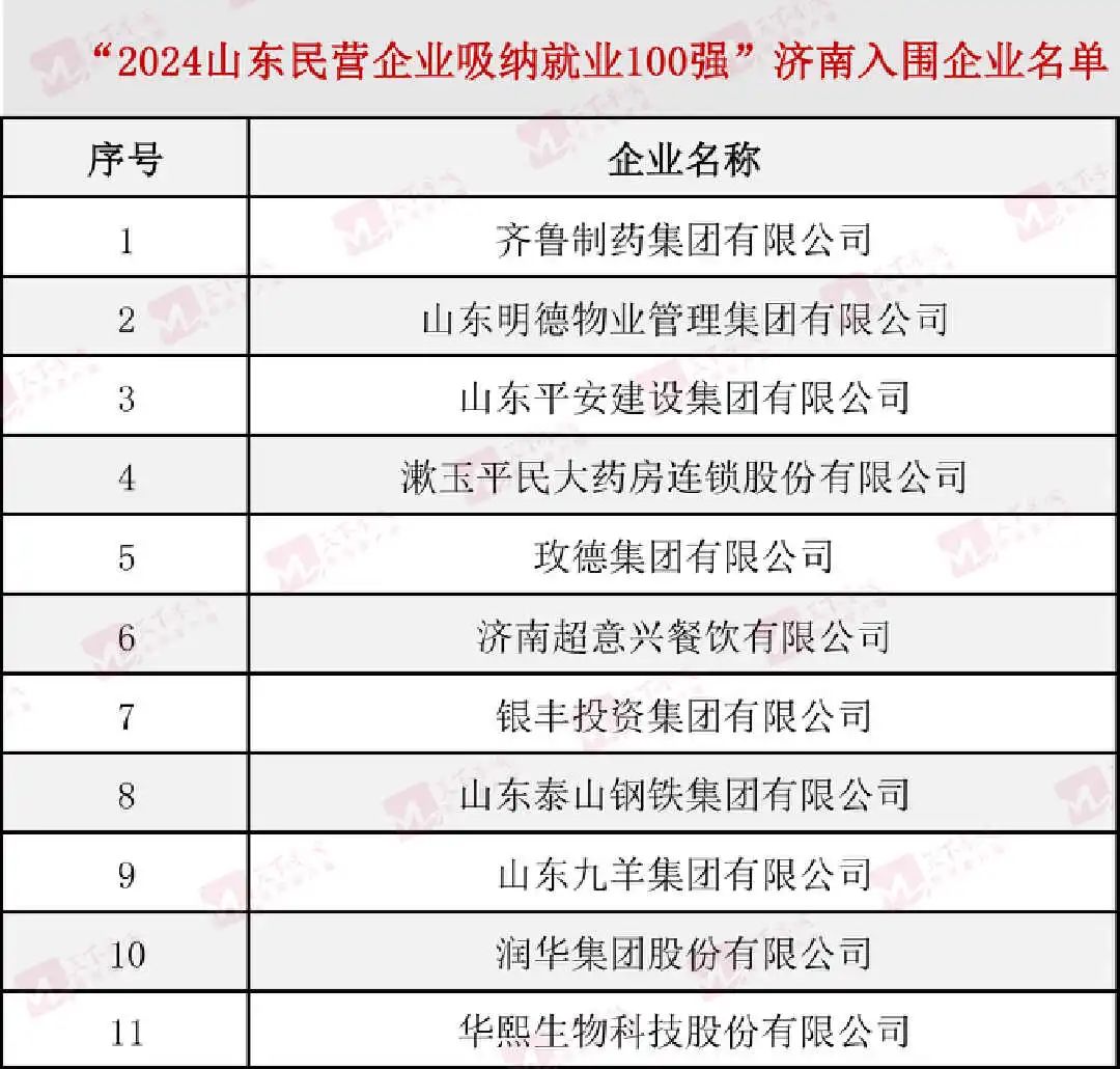 在“2024山东民营企业吸纳就业100强名单”中,济南11家入围企业分别为:齐鲁制药集团有限公司、山东明德物业管理集团有限公司、山东平安建设集团有限公司、漱玉平民大药房连锁股份有限公司、玫德集团有限公司、济南超意兴餐饮有限公司、银丰投资集团有限公司、山东泰山钢铁集团有限公司、山东九羊集团有限公司、润华集团股份有限公司、华熙生物科技股份有限公司。