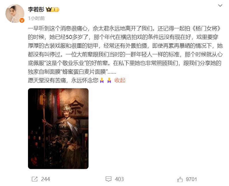 李若彤:一早听到这个消息很痛心,佘太君永远地离开了我们。还记得一起拍《杨门女将》的时候,她已经五十多岁了,那个年代在横店拍戏的条件远没有现在好,戏里要穿厚厚的古装戏服和很重的铠甲,经常还有外景拍摄,即使再累再暴晒的情况下,她都没有叫停过。一位大前辈跟我们当时的一群年轻人一样的标准,那个时候就从心底佩服“这是个敬业乐业”的好前辈。在私下里她也非常照顾我们,跟我们分享她的独家自制面膜“蜂蜜蛋白麦片面膜”……愿天堂没有苦痛,永远怀念您。