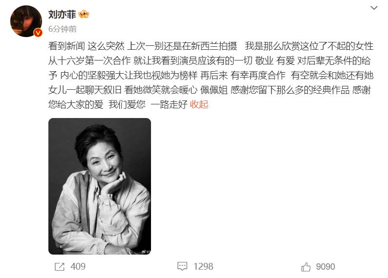 刘亦菲:看到新闻,这么突然,上次一别还是在新西兰拍摄。我是那么欣赏这位了不起的女性,从十六岁第一次合作,就让我看到演员应该有的一切,敬业,有爱,对后辈无条件的给予,内心的坚毅强大,让我也视她为榜样,再后来,有幸再度合作,有空就会和她,还有她女儿一起聊天叙旧,看她微笑就会暖心。佩佩姐,感谢您留下那么多的经典作品,感谢您给大家的爱,我们爱您,一路走好。