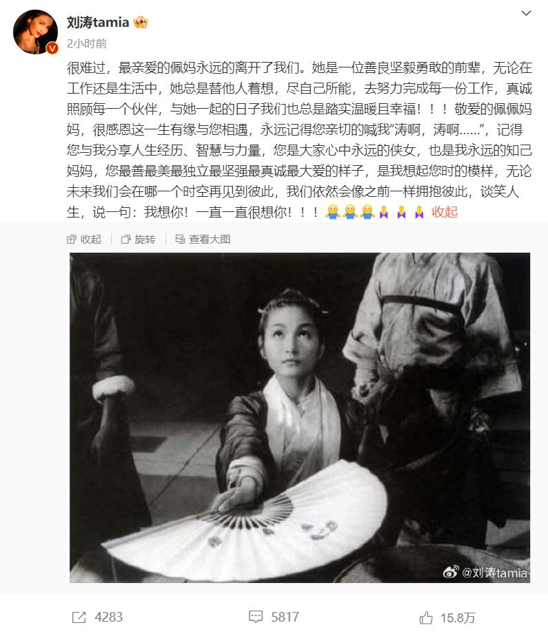 刘涛:很难过,最亲爱的佩妈永远的离开了我们。她是一位善良坚毅勇敢的前辈,无论在工作还是生活中,她总是替他人着想,尽自己所能,去努力完成每一份工作,真诚照顾每一个伙伴,与她一起的日子我们也总是踏实温暖且幸福!!!敬爱的佩佩妈妈,很感恩这一生有缘与您相遇,永远记得您亲切的喊我“涛啊,涛啊……”,记得您与我分享人生经历、智慧与力量,您是大家心中永远的侠女,也是我永远的知己妈妈,您最善最美最独立最坚强最真诚最大爱的样子,是我想起您时的模样,无论未来我们会在哪一个时空再见到彼此,我们依然会像之前一样拥抱彼此,谈笑人生,说一句:我想你!一直一直很想你!!!