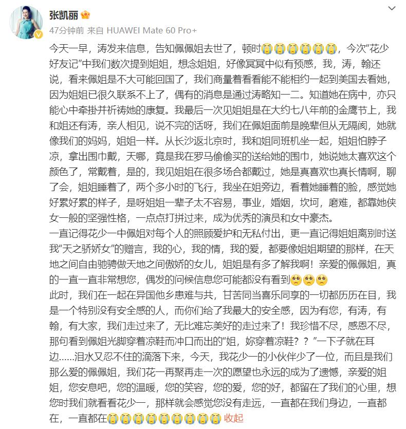 张凯丽:今天一早,涛发来信息,告知佩佩姐去世了,顿时流泪,今次“花少好友记”中我们数次提到姐姐,想念姐姐,好像冥冥中似有预感,我,涛,翰还说,看来佩姐是不大可能回国了,我们商量着看看能不能相约一起到美国去看她,因为姐姐已很久联系不上了,偶有的消息是通过涛略知一二。知道她在病中,亦只能心中牵挂并祈祷她的康复。我最后一次见姐姐是在大约七八年前的金鹰节上,我和姐还有涛,亲人相见,说不完的话呀,我们在佩姐面前是晚辈但从无隔阂,她就像我们的妈妈、姐姐一样。从长沙返北京时,我和姐同班机坐一起,姐姐怕脖子凉,拿出围巾戴,天哪,竟是我在罗马偷偷买的送给她的围巾,她说她太喜欢这个颜色了,常戴着,是的,我见姐姐在很多场合都戴过,她是真喜欢也真长情啊,聊了会,姐姐睡着了,两个多小时的飞行,我坐在姐旁边,看着她睡着的脸,感觉她好累好累的样子,是呀姐姐一辈子太不容易,事业、婚姻、坎坷、磨难,都靠她侠女一般的坚强性格,一点点打拼过来,成为优秀的演员和女中豪杰。一直记得花少一中佩姐对每个人的照顾爱护和无私付出,更一直记得姐姐离别时送我“天之骄娇女”的赠言,我的心,我的情,我的爱,都要像姐姐期望的那样,在天地之间自由驰骋做天地之间傲娇的女儿,姐姐是有多了解我啊!亲爱的佩佩姐,真的一直一直非常想您,偶发的问候信息您可能都没有看到。
