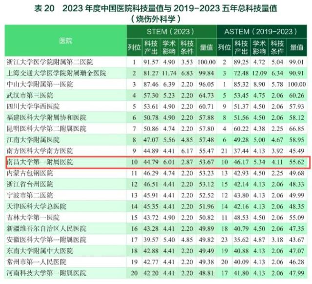 7月19日,中国医学科学院发布2023年度中国医学院校/医院科技量值(STEM)暨五年总科技量值(ASTEM)。南大一附院2023年度STEM值位列全国95名,相较去年进步20名,ASTEM值位列100名,是省内唯一入围全国百强的医疗机构 。医院30个学科进入全国前100名,较去年增加6个,17个学科排名上升。其中,烧伤外科学排名全国第10位。2023年新增的核医学、放射学、超声医学三个学科,医院均进入榜单。
