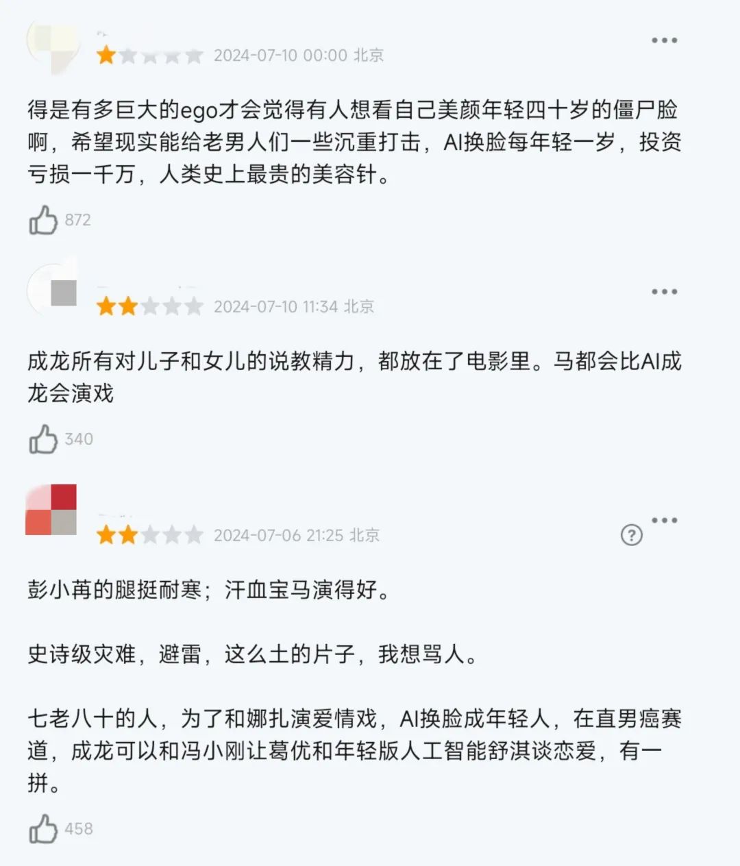 至于AI成龙,槽点更是比战场上的兵马还多。由于运用了AI换脸,AI成龙画质高糊。别人都是4k,只有他是1080p,还磨皮严重。