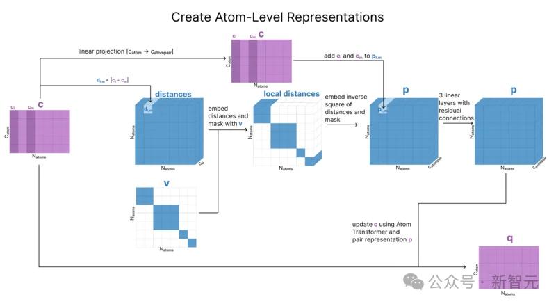 然后,我们用c来初始化原子级别的配对表征p,以存储原子间的相对距离。