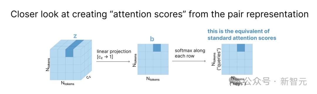 如下图所示,在张量z中,每个cz维度的向量zi,j都表示第i个和第j个token间的关系。将z线性投影到矩阵b后,每个zi,j向量变为标量,就可以相当于「注意力分数」(attention score),用于加权平均。