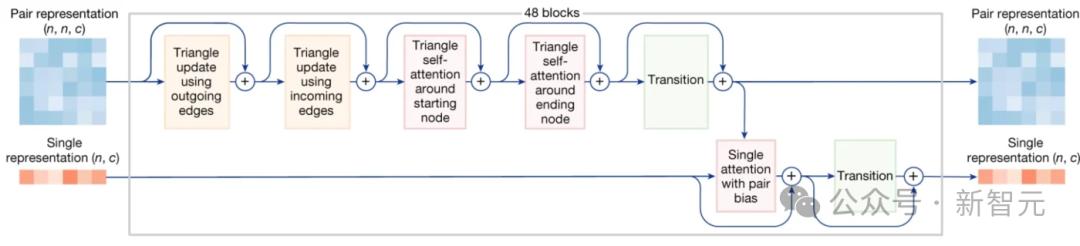 经过前两个模块后,模板t和MSA表征m的作用就结束了,只有单一表征z和经过更新的配对表征s进入Pairformer并用于相互更新。