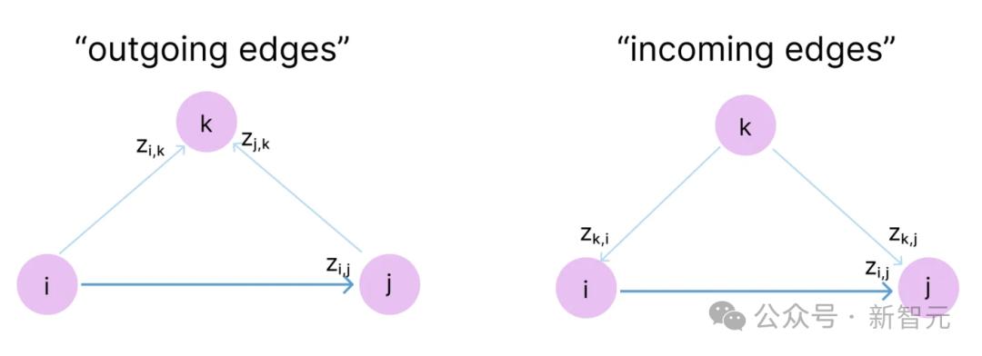 所以,如上图所示,在对节点k进行「三角更新」和「三角自注意力」操作时,需要分别查看两种有向路径,出边(outgoing edge)和入边(incoming edges)。