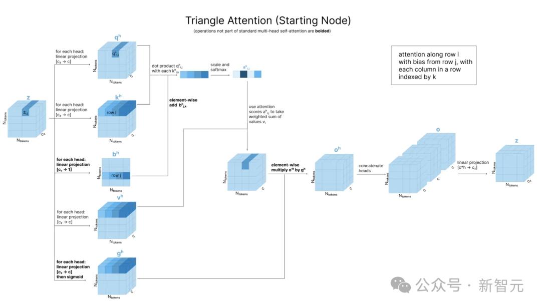 接下来,分别使用出边和入边的「三角自注意力」更新每个zi,j值。AF3论文将这两个过程分别称为「围绕起始节点」(around starting node)和「围绕结束节点」(around ending node)。