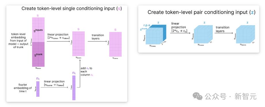 为了初始化token级条件表征,我们将ztrunk与相对位置编码拼接,然后将这个更大的表征向下投影,并通过几个带有残差连接的转换模块。