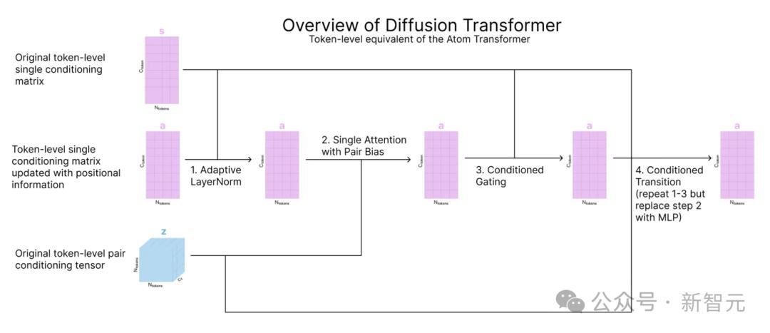 这一步的目标是运用注意力机制更新原子坐标和序列信息的token级表征a。这一步使用的是输入准备过程中可视化的扩散Transformer,它与原子Transformer相同,但针对token。