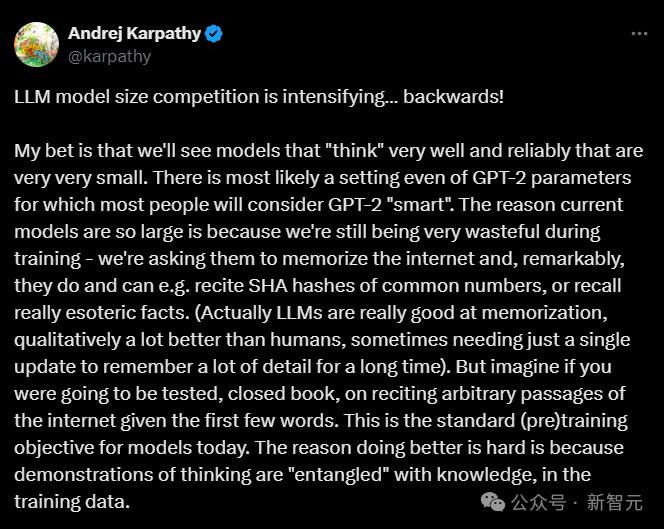 Karpathy相信如果有更高质量的训练数据集,完全可以训练出一个规模更小,能力更强,更有推理能力的模型。