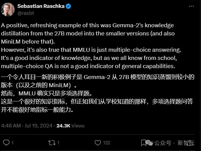 《Python机器学习》作者Sebastian Raschka认为,这就像是知识蒸馏,从27B的大模型蒸馏出Gemma-2这样的小模型。他也提醒我们,MMLU这种多选题测试,可以测试知识,但不能完全反映实际能力。