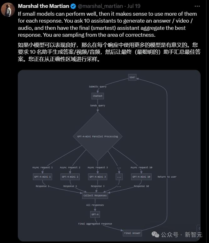 也有网友脑洞大开,如果小模型表现得好,那么术业有专攻,为什么不用更多的小模型来生成一个个回答呢?召集10个AI助手,然后让最聪明的那个做最后的总结,简直是AI版的智囊团。