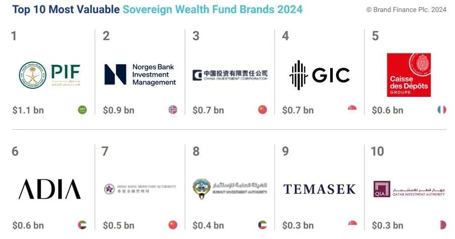 在主权财富基金中,沙特公共投资基金、挪威央行投资管理机构、中投公司排名前三。品牌价值被理解为品牌所有者通过在公开市场上许可该品牌所获得的净经济收益。
