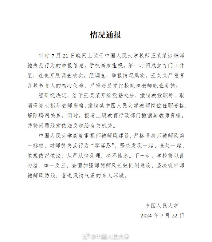 7月22日,中国人民大学官方微博发布声明:7月21日晚,中国人民大学关注到网上关于我校教师王某某涉嫌师德失范行为的举报信息后,高度重视,第一时间成立工作组,连夜开展调查核实。我校严格坚持师德师风第一标准,对师德失范行为“零容忍”,坚决发现一起、查处一起,依规依纪依法、从严从快处理,决不姑息。学校将于近日公布调查处理结果。
