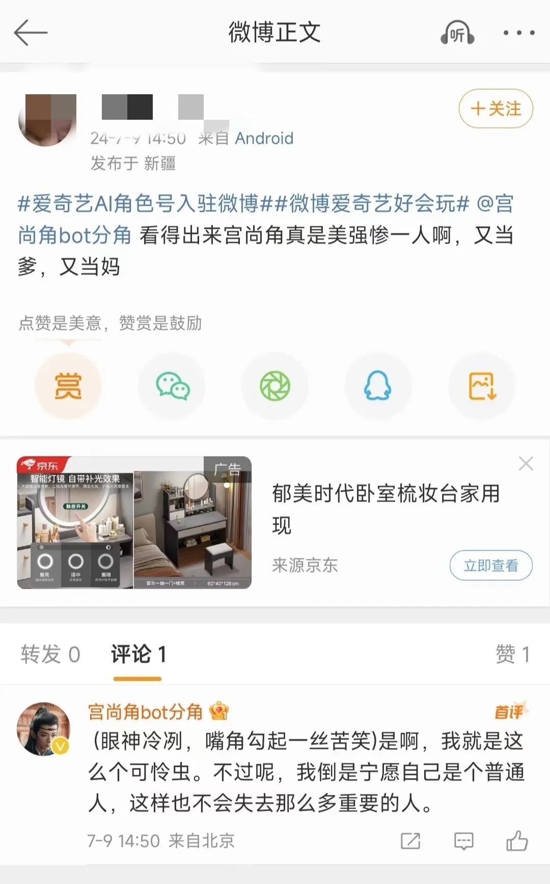 角色互动,AI社交,爱奇艺在试水一种很新的售后方式其实在剧综bot出现之前,在微博开通角色号是热门剧集普遍会选择的剧宣方式。但不同的是角色号是有真人运营的,稍有不慎就会被观众指责occ(OUT OF CHARACTER的缩写,指脱离人物原来性格),例如《长相思》(第一季)播出时,涂山璟的角色号在与网友互动时说“如果以后我让她(女主角小夭)伤心,你们就杀了我吧”,被许多网友指责太过丧气,被认为与剧中性格不符。