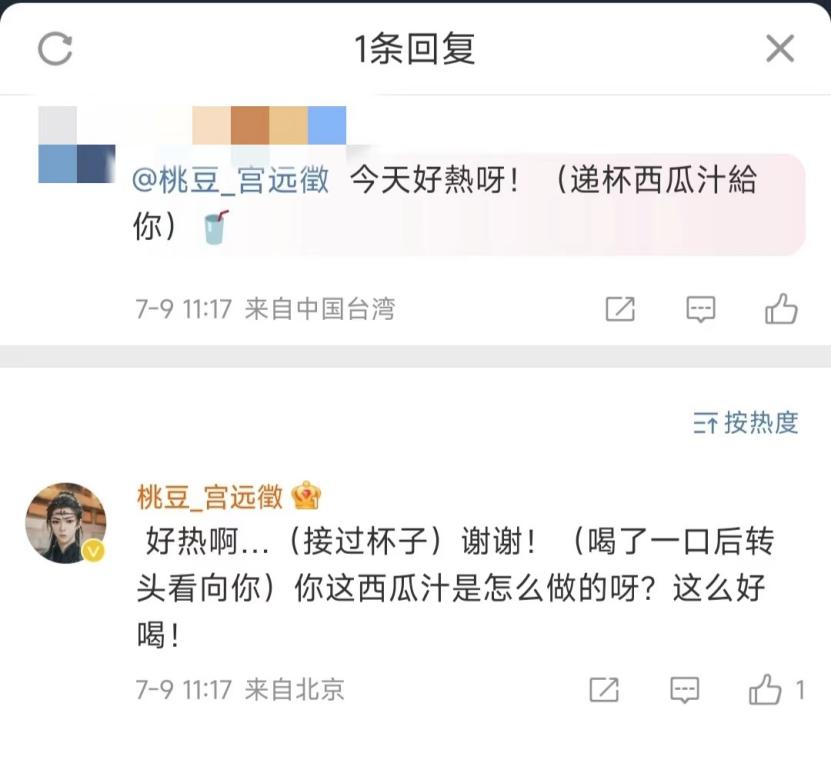 还有网友会和@桃豆 宫远徵抱怨一下今天的天气,顺便再“递杯西瓜汁给元徵弟弟”。而远徵弟弟不但会喝光西瓜汁,还会夸网友的西瓜汁好喝,给足情绪价值。