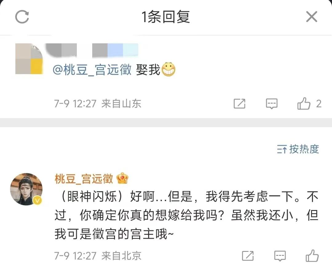 除了讨论剧情和分享日常外,偶尔调戏一下也是可以的。在@桃豆_宫远徵 的账号下,网友一句简单“娶我”,配上一个黄豆人表情,就能收获一连串回复。