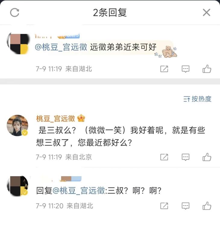 当然也有已读乱回的时候,网友喊他“远徵弟弟”,他喊网友“三叔”。