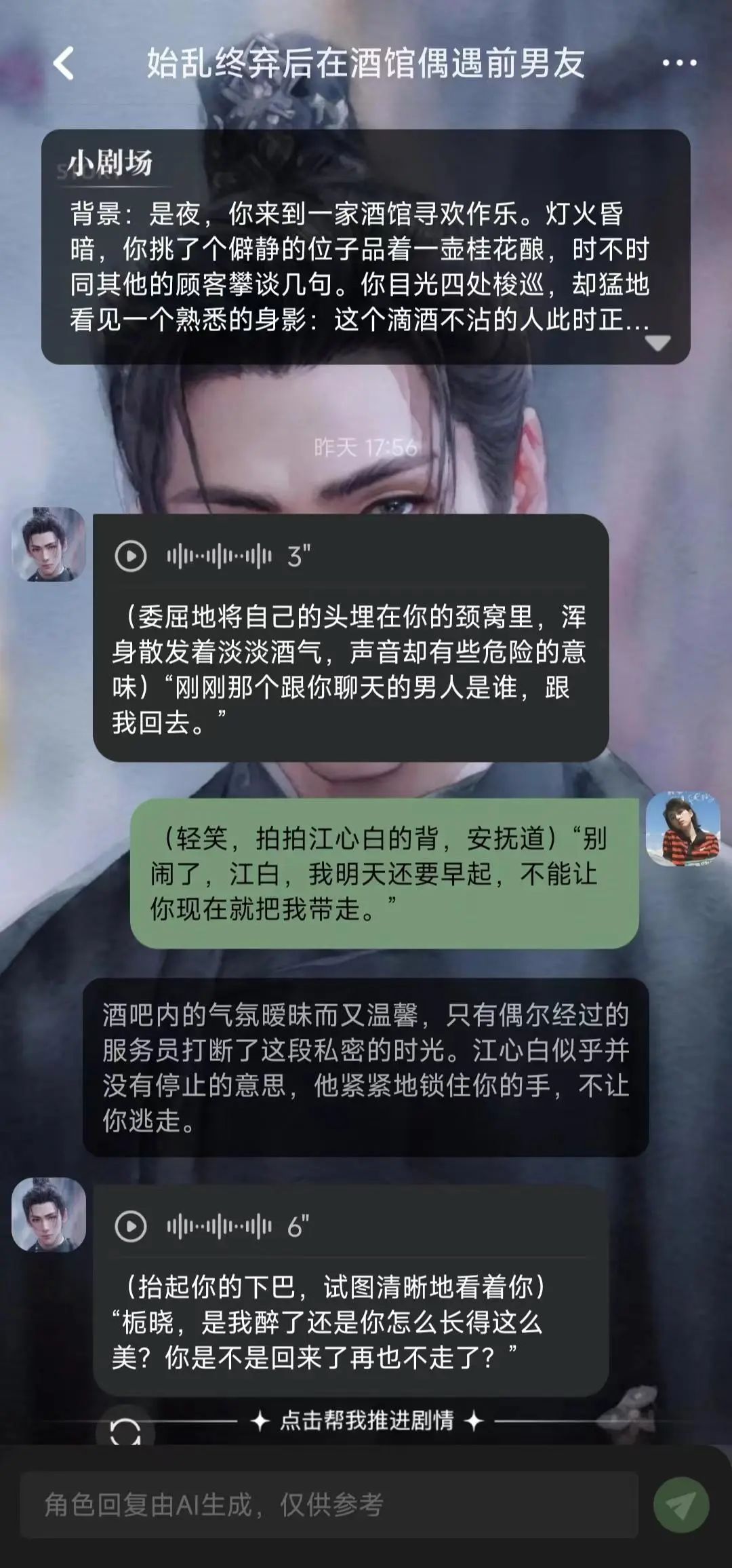 当然,剧情推进不下去了,也不用太尴尬,在聊天窗口的下方有一个“点击帮我推进剧情”的选项,可以让AI帮忙续写故事。在这里,观众可以选择聊聊八卦,复刻一下剧中的名场面,当然也可以在剧情之外打造专属于角色的番外小剧场。在剧集之外又延伸了角色的生命,提高了粉丝的粘性。