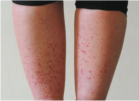 图片来源:《中国皮肤病性病图鉴》(第 3 版)色素性紫癜从样子上看,它的红色淤点会融合成片,向外扩展,可能会轻微发痒。它对健康的影响也不大,具体可以去医院进一步评估。