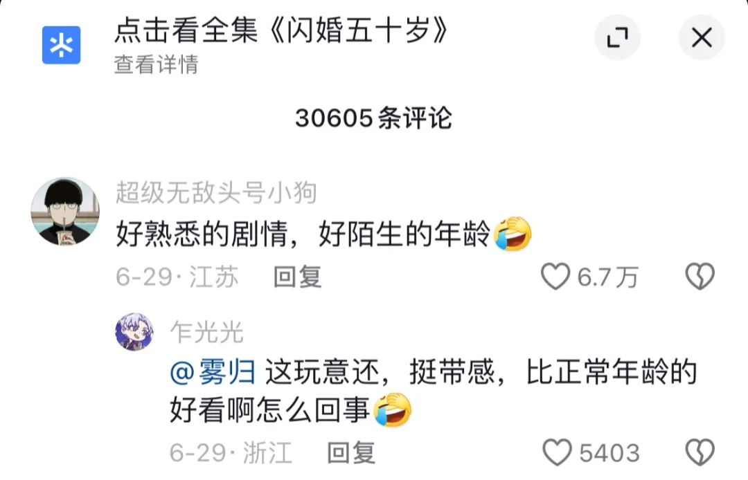 硬糖君一天中先后在韩剧《她的日与夜》与国产微短剧《闪婚五十岁》的视频底下,看到同一条评论。这就不能说是巧了,怕不是什么新潮流?