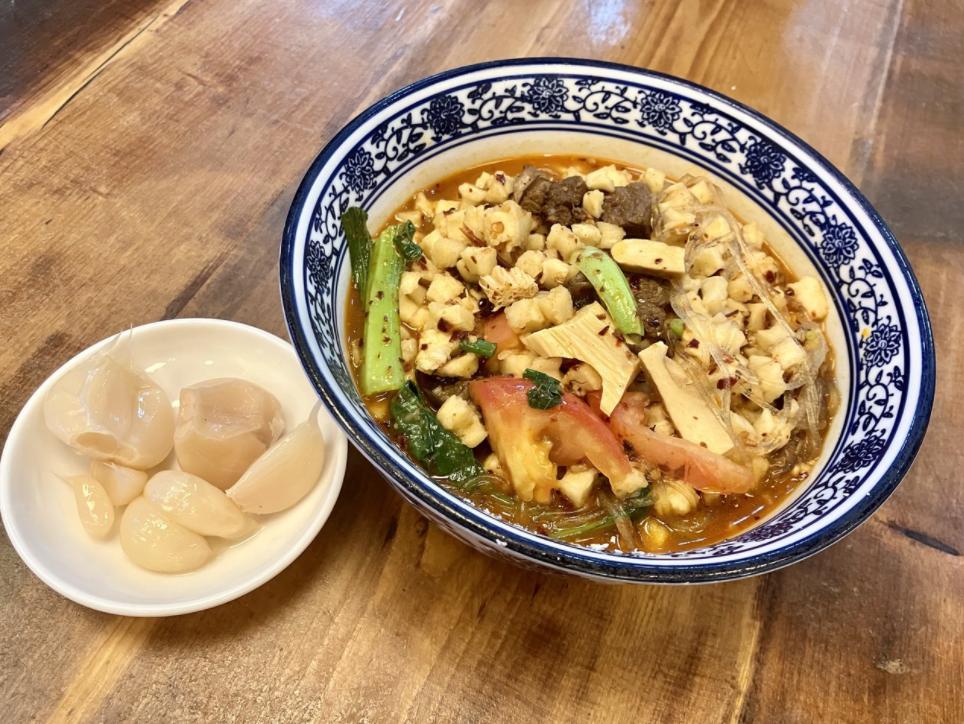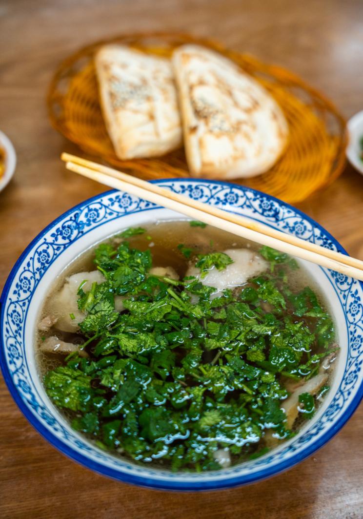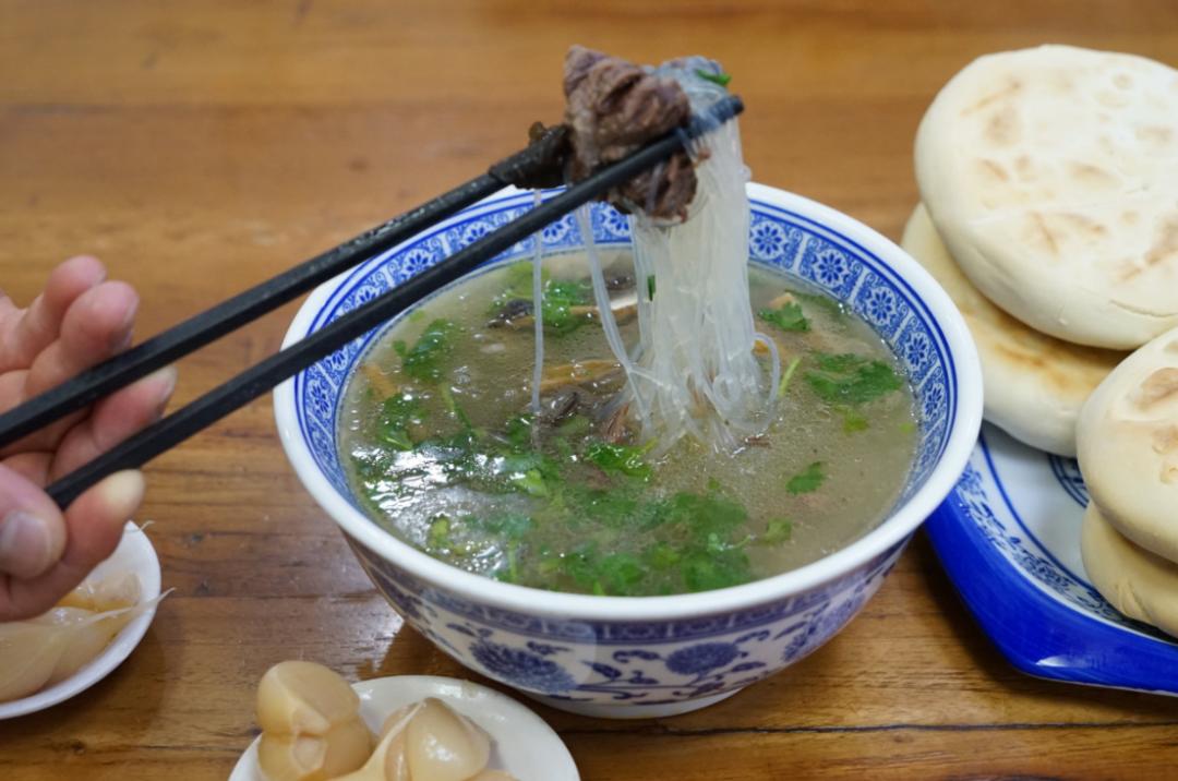 水盆羊肉第一口汤的味道微微有点咸,但非常温润醇厚。再来片羊肉,软烂香嫩,不仅没有讨人厌的膻味儿,甚至还有股淡淡的奶香,专治不吃羊肉。底下还垫着一些粉丝,口感劲道。辣子和醋也是每家饭馆标配,加点儿进汤里,每根粉丝都均匀裹上辣子的香气,在秋风渐起的夜晚,大口吸溜,暖乎乎的幸福感蔓延到全身。