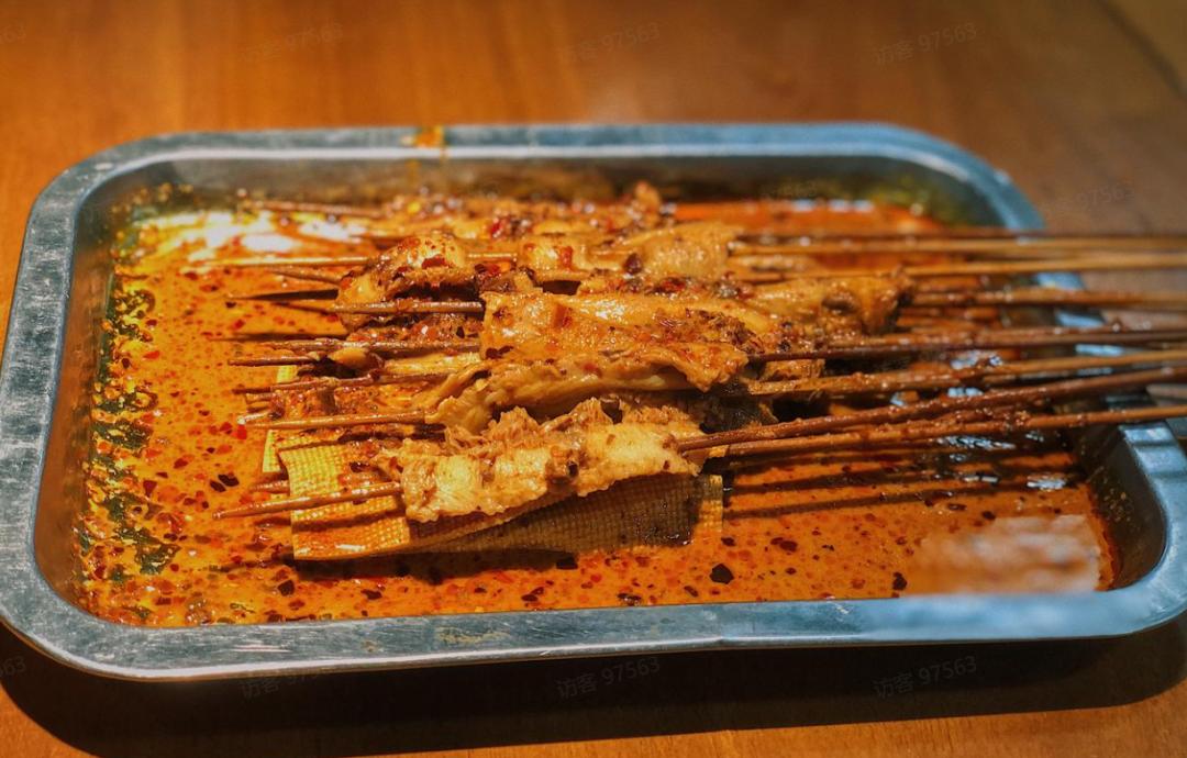 小酥肉还有西安夜市名吃麻酱涮牛肚,竹签简单穿着牛肚串儿,香喷喷的麻酱掺了点油香的辣子,这个酱料简直蘸鞋底都香。常见组合是豆皮和牛肚,荤素搭配,好吃不贵。