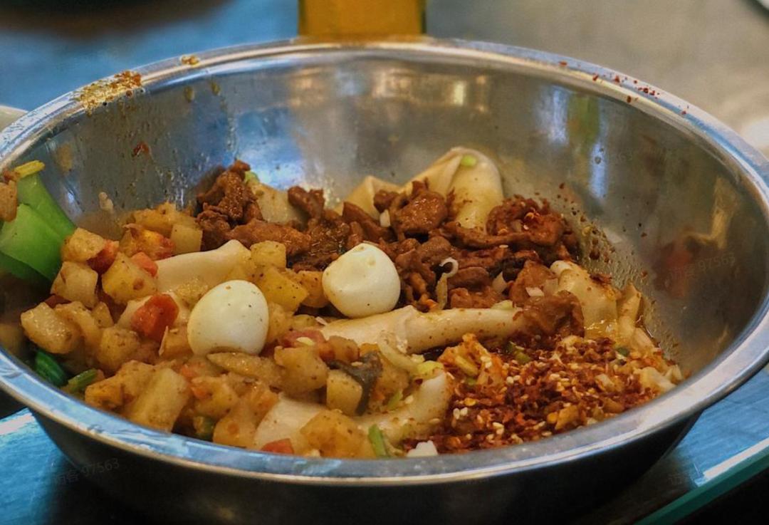 虽然也叫小酥肉,可不是干炸,而是汤汤水水的一碗糊糊。炸好的酥肉又重新蒸到软烂后,再泡在汤里。油汪汪的汤里漂浮着脱落的面糊,卖相看着宛如黑暗料理,但实际上是咸味和孜然、花椒、胡椒的存在感拉到最大,来自塞外的冲击感香料,与牛肉天生绝配。酥肉可以蘸店里的辣椒油配饭吃,由于实在太油,并不建议连汤一起扫荡干净。