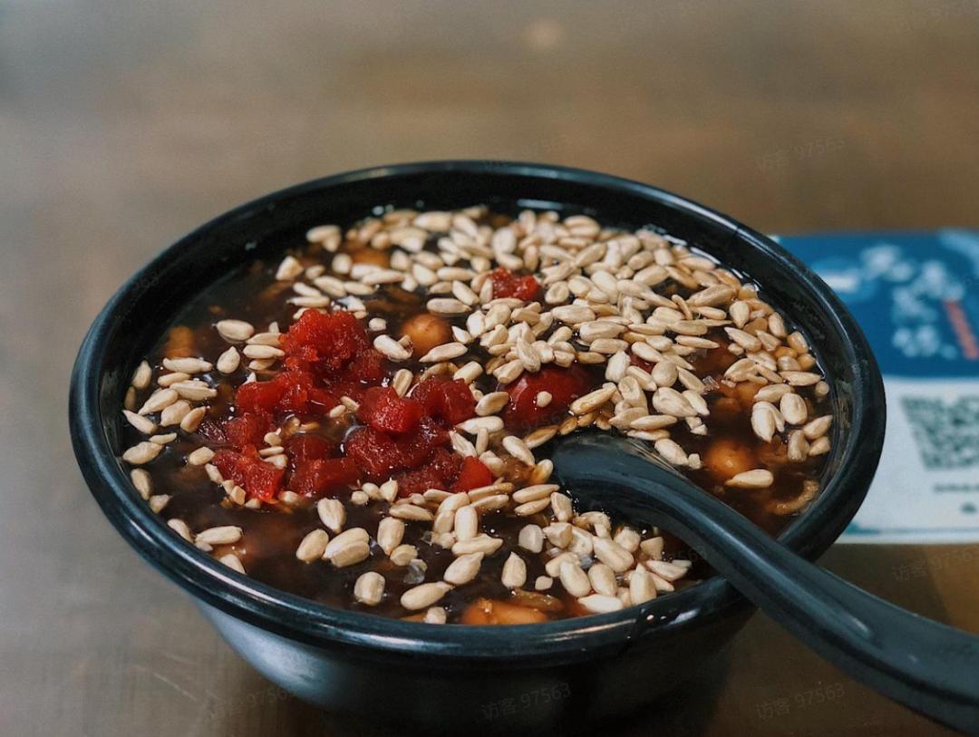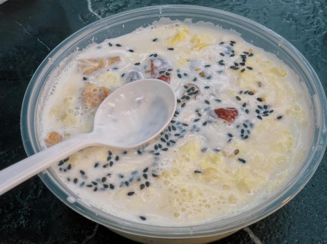 八宝粥跟八宝粥类似的底料用到牛奶鸡蛋醪糟里,营养的感觉瞬间拉满。再多加点黑芝麻、枸杞点缀,一碗现煮的暖暖酒酿,散发着热乎乎的奶香,酒味儿微乎极微。秋冬坐在窗边喝一碗,看路边树影斑驳,心中涌起专属于市井烟火的平稳踏实。