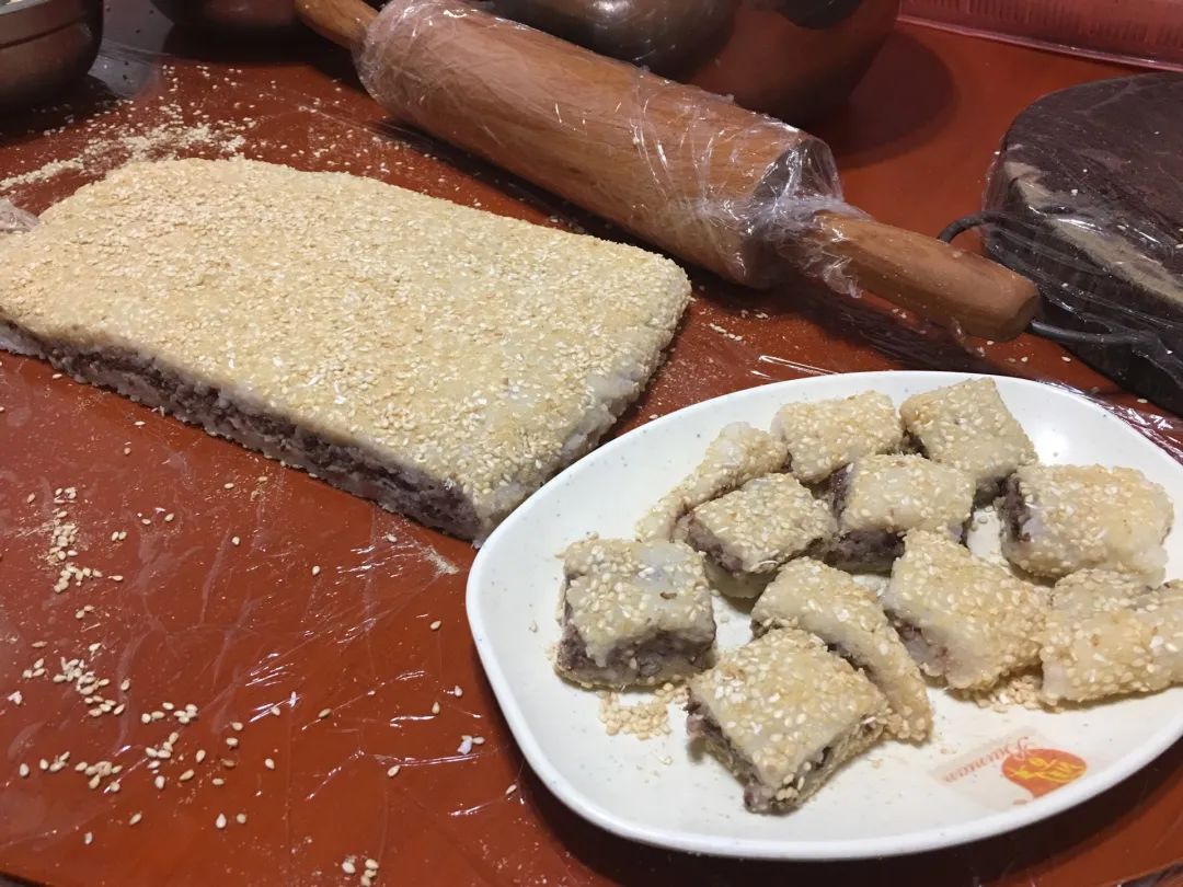 柿子糊塌如果喜欢类似酥脆表皮、甜蜜流心的食物,江米糕也值得一试。果仁、黑白芝麻混合着红糖白糖为馅,加了大量干果的糖油混合物,哪有不香的?