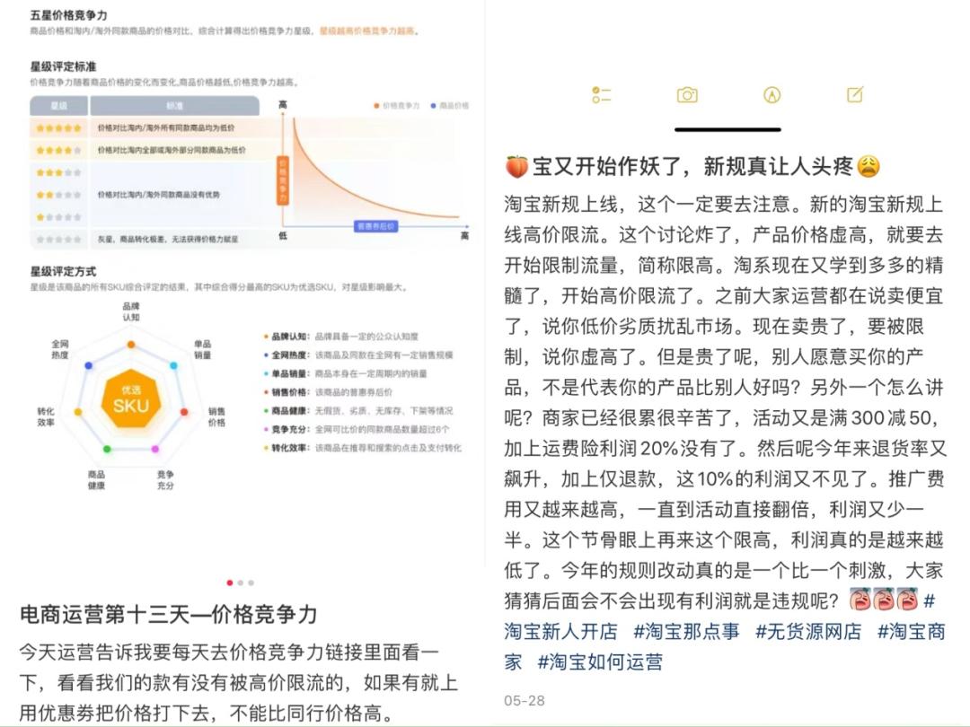 小红书上关于淘宝高价限流的讨论锌刻度从商家提供的淘宝规则了解到,高价限流是淘宝“五星价格竞争力”规则中的一部分,其中提到,“商品价格和淘内/淘外同款商品的价格对比,综合计算得出价格竞争力星级”而星级越高,获得的流量也越高。
