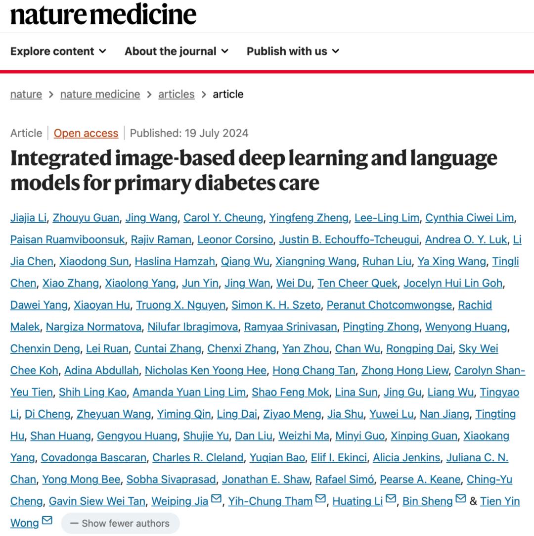 2024年7月19日,清华大学黄天荫教授团队、上海交通大学电院计算机系/教育部人工智能重点实验室盛斌教授团队、上海交通大学医学院附属第六人民医院贾伟平教授和李华婷教授团队、新加坡国立大学覃宇宗教授团队合作,在 Nature Medicine 期刊发表了题为:Integrated image-based deep learning and language models for primary diabetes care 的研究论文。