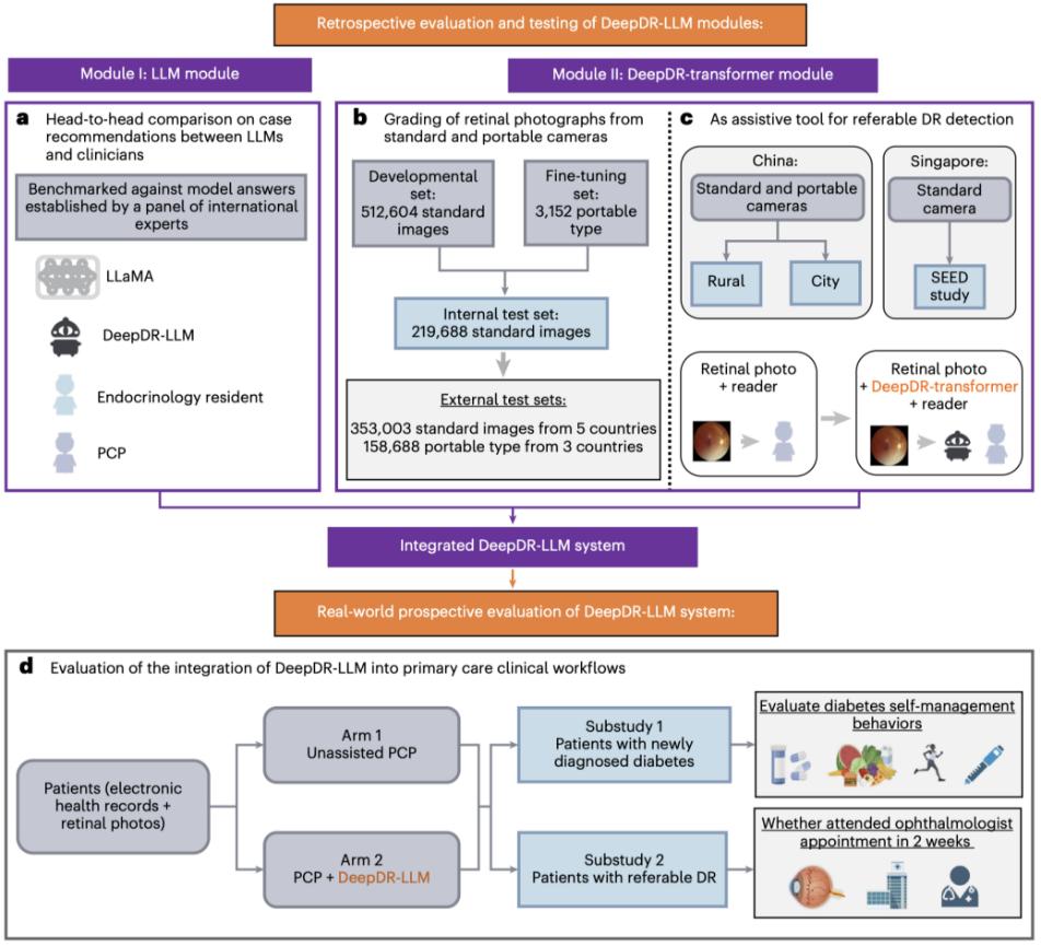 研究团队通过医工交叉合作研究,构建了全球首个面向糖尿病诊疗的视觉-大语言模型的多模态集成智能系统——DeepDR-LLM。
