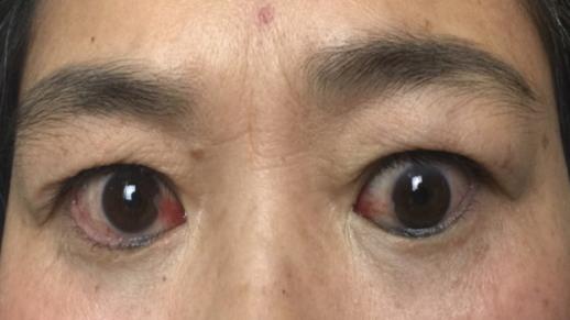 由于病变累及上眼睑,出现特征性的眼睑退缩和上睑迟滞,是甲状腺相关眼病的重要特征。通俗的说,眼睑退缩就是眼皮退缩,眼白暴露很大(瞪眼),上睑迟滞就是眼球下转时上眼皮不能跟着落下。